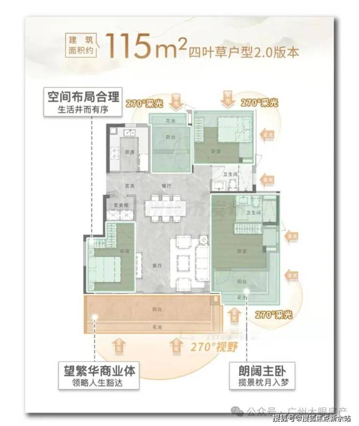 另一个则是户型本身独具魅力,没有选择传统格局,而是带来更新潮的“四叶草”户型2.0版本。