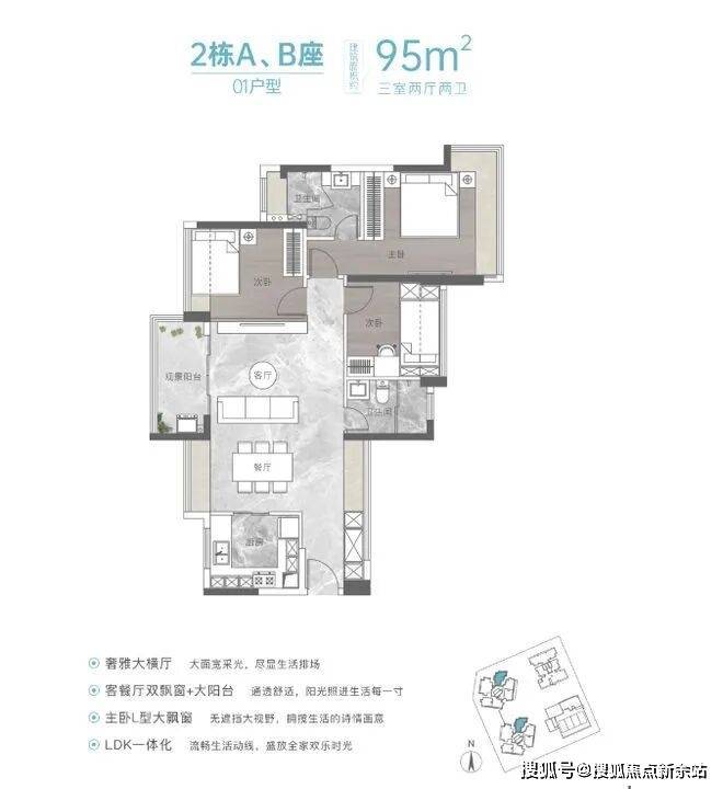 ⑥:建面约95㎡是横厅三房两厅两卫户型,优点在于它是横厅,是通透的。