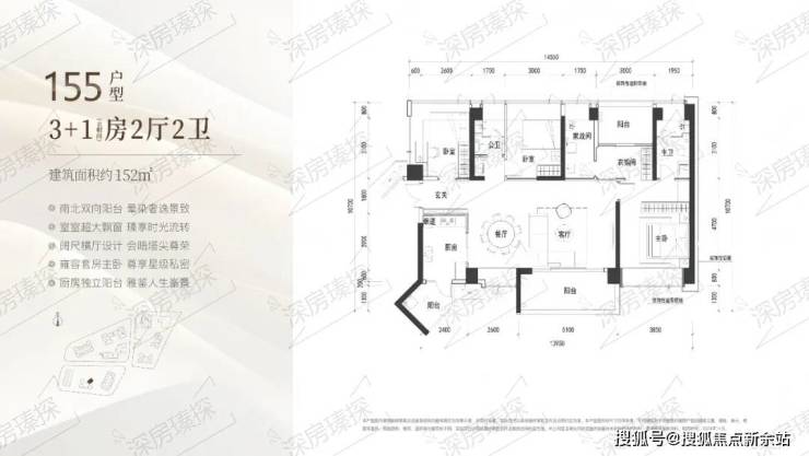 152㎡的4房2厅2卫,3栋2单元01户型,设计的是横厅南北通透格局,进门入户玄关,客餐厅7.7米开间,LDKB一体化设计,四开间朝南,4个卧室分别做到了主卧21.17㎡/次卧12.4㎡/次卧11.7㎡/次卧11.7㎡(包含墙体飘窗),客厅出5.1米长阳台,L型厨房带1个生活阳台,公卫三段式分离,得房率约90%(包含赠送),东南朝向。
