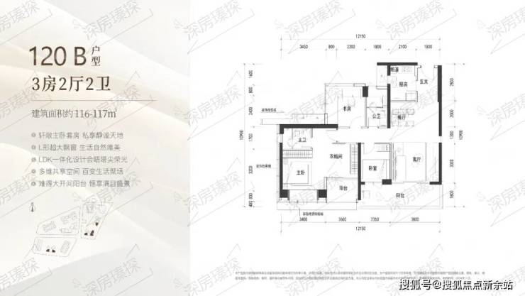 117㎡的3房2厅2卫,B户型(2栋4单元01.02.05/3栋2单元02/05户型),设计的是经典竖厅格局,客厅3.8米开间,LDKB一体化设计,3个卧室分别做到了主卧28.6㎡/次卧9.6㎡/次卧7.05㎡(包含墙体飘窗),客厅连接次卧出6.15米长的宽景大阳台,U型厨房,卫生间干湿分离,得房率约90%(包含赠送),东南或正东朝向。其实也可以改4房。