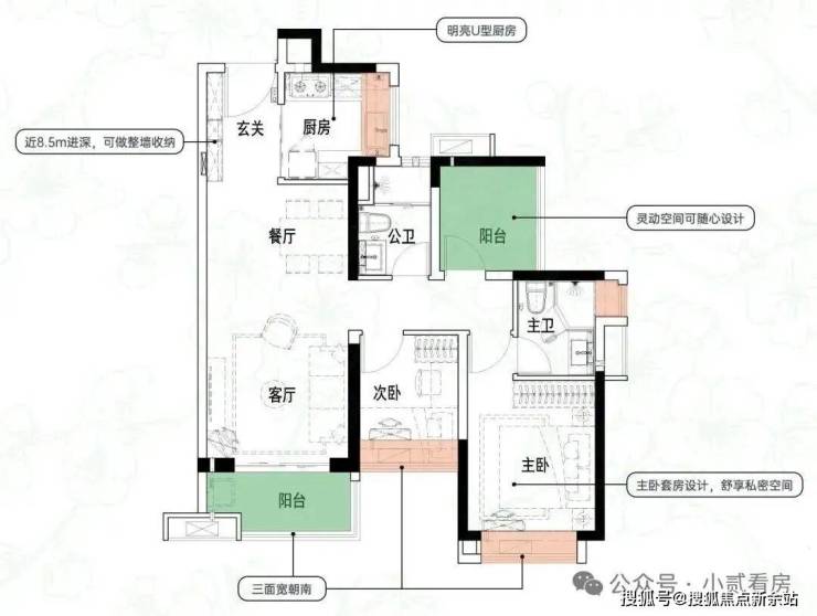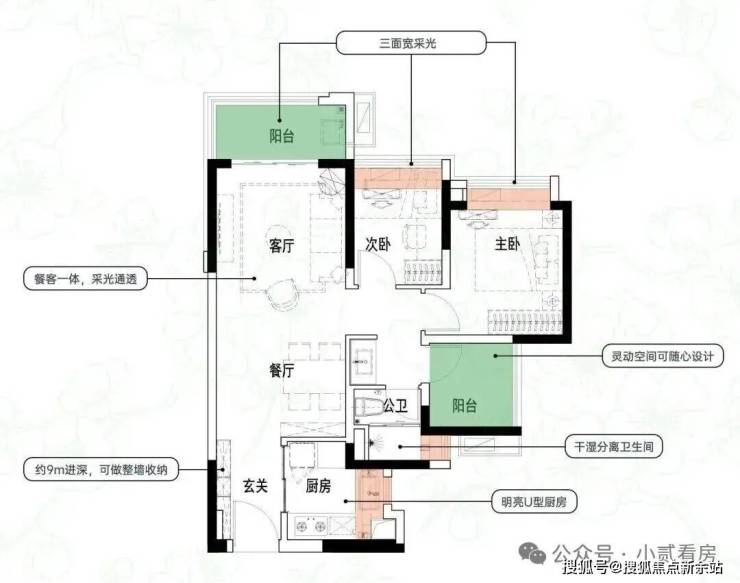 建面约84㎡3空间2厅2卫|得房率约93.5%