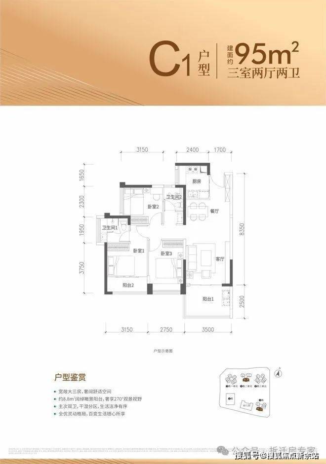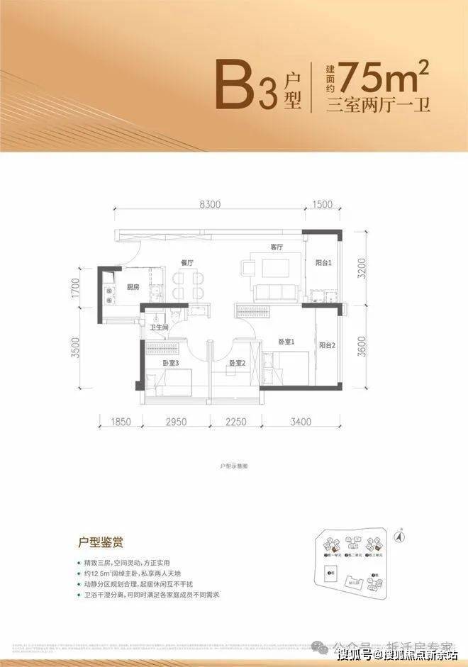 设计的是经典竖厅格局,客厅3.5米开间,进深8.35米,LDKB一体化设计,三开间朝南,3个卧室分别做到了主卧13.8㎡/次卧10.31㎡/次卧9.13㎡(包含墙体飘窗),U型厨房,公卫三段式分离,得房率约79%(不含赠送),西南或正南朝向。售楼处热线:400-879-1931 中介勿扰