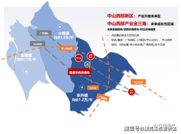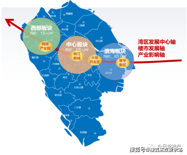 受湾区资源外溢,制造产业发展,中山被分别划分为“滨海板块、中心板块、西部板块”三大板块,楼市和产业受城市发展轴风口从滨海板块渐移向西部板块,其中西部板块现仍处于发展期,为中山楼市具有大潜力空间发展的价格洼地板块;