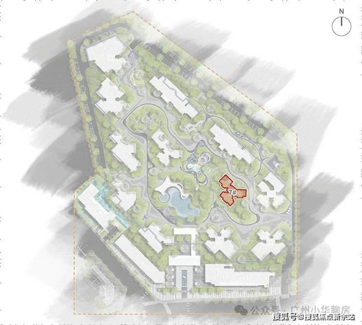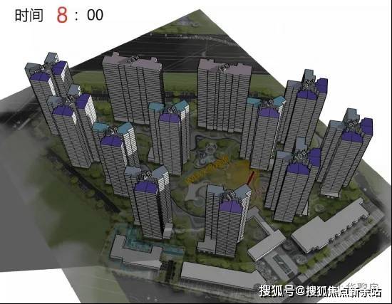 项目目前在售的是南区,一共打造了12栋32层住宅(但11栋和12栋自持不卖,所以在售仅10栋),整体楼栋建筑围合布局,号称全部单位都朝南,实现户内全明采光。