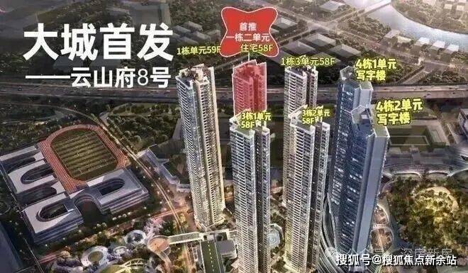 项目由8座建筑分2排组成,1栋1-2-3单元和3栋1-2单元为58-59层(约180米)住宅,标准层高2.9米,4梯6户;4栋1-2单元为35层(约165米)写字楼,2栋为幼儿园。地块住宅均为商品房性质,有1566户,配2220辆车位。