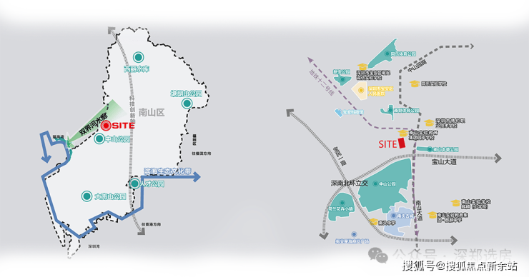 位于深圳南山区中部组团,属于粤港澳大湾区第一发展圈层,是高新技术、文化创意、文脉传承于一体的创新发展片区。场地区域位置优越,周边配套丰富,2KM 范围内有公园、学校、南头古城商圈、医院、地铁等;场地高层视线开阔,可远眺深圳湾。