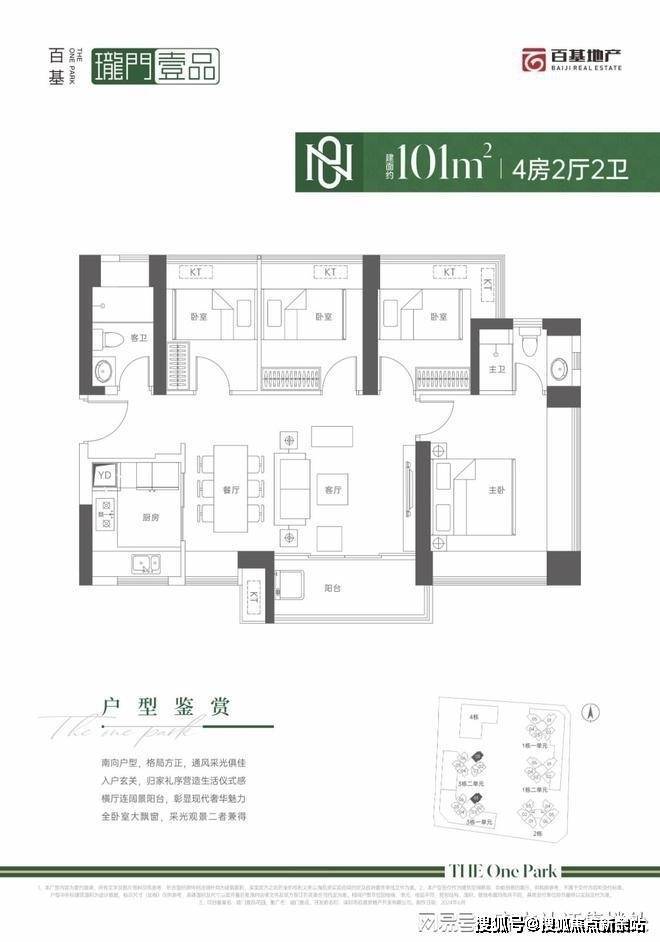 101㎡的4房2厅2卫,设计的是横厅南北通透格局,进门入户玄关,客餐厅5.55米开间,LDKB一体化设计,四开间朝南,4个卧室分别做到了3.85米/2.6米/2.4米/2.35米的宽度,主卧270°双飘窗,U型厨房,卫生间干湿分离,得房率:71.29%(不含赠送),阳台主朝东南向。