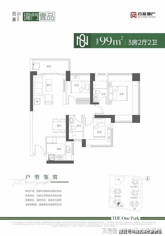 99㎡的3房2厅2卫,设计的是经典竖厅格局,进门入户玄关,客厅3.9米开间,LDKB一体化设计,动静分区,四开间朝南,主卧三面飘窗,U型厨房,卫生间干湿分离,得房率:71.29%(不含赠送),东南朝向。