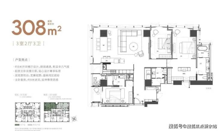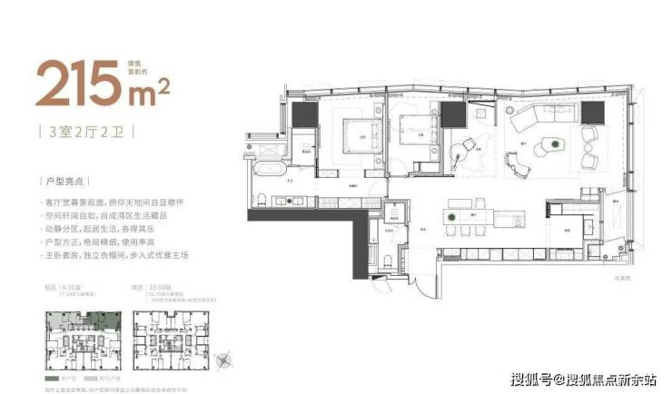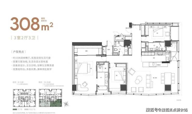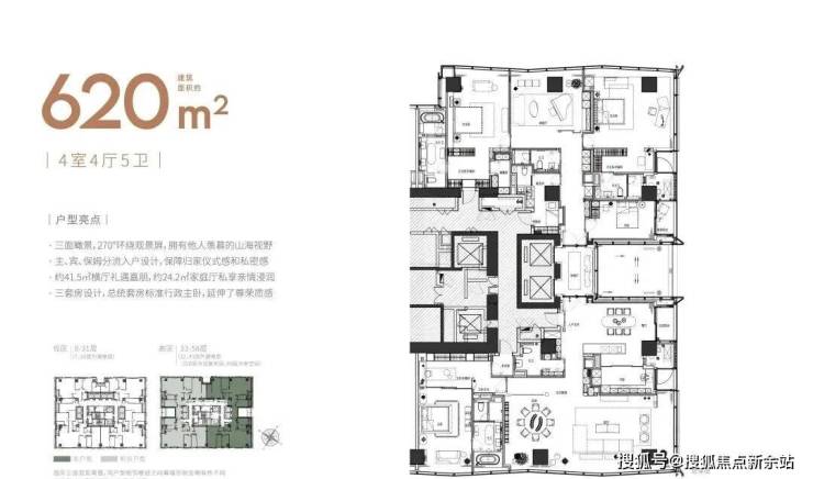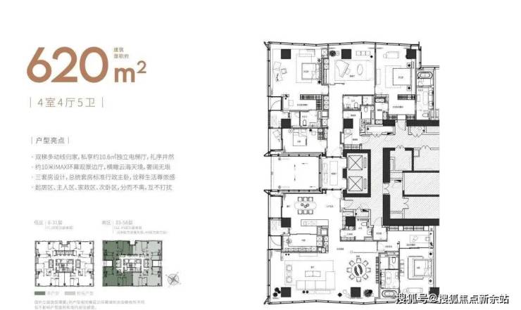 大平面大尺度定位,层高约3.6米,横厅设计确保奢阔观景面,全户型纵享环幕视野。项目打造建面约215-620㎡纯粹品质公寓,顶层为建面约1270㎡公寓产品。