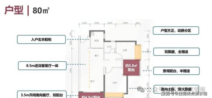 建面约80㎡的户型开间就有约3.5米,格局方正、动静分离、空间开阔、采光充足。基本上达到了市面上90㎡以上户型的尺度。