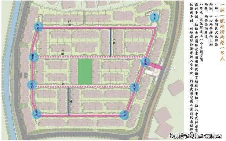 岭南院子的园林采用的是岭南新中式风格,整体设计采用一环、一院、两街、两巷、八节点的的设计。