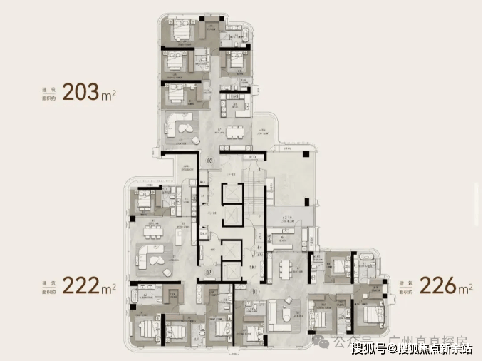 226㎡户型特点: 4T3户,均有独立电梯及门厅互不扰; ·8*8.4m大方厅,宽敞大气; ·超款客厅落地景观面,客厅、阳台、众数套房可望 江望琶洲总部及广州塔,景观优势(无主阳台); ·有独立工人房但无赠送平台; ·主卧270°景观转角飘窗,800mm飘窗可打;