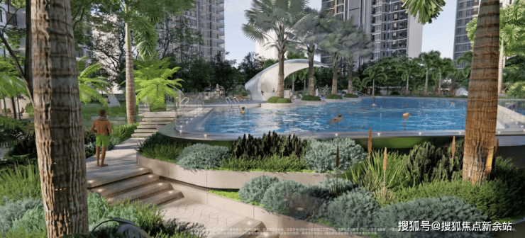➢灵动水系+热带立体花园:融合约1000㎡立体水系(成人泳池+儿童戏水池+叠级水景),搭配紫花风铃木等热带花木,营造“度假即日常”的沉浸式生活场景