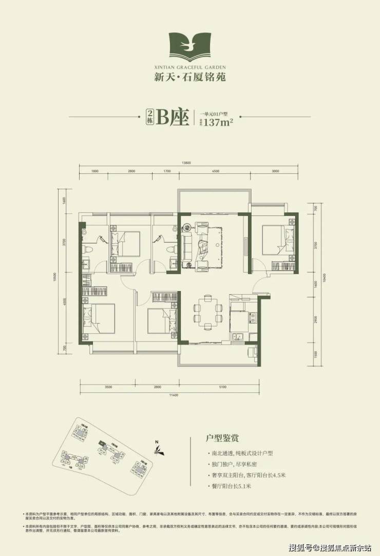 2栋B座一单元01、04户型、2栋B座二单元01户型:面积约为137-138㎡的4房2厅2卫;