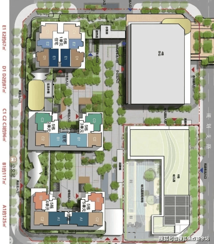 共由四栋54-64层的超高层住宅+两栋保障性住房+三栋办公楼组成,另外配建一所12班幼儿园。