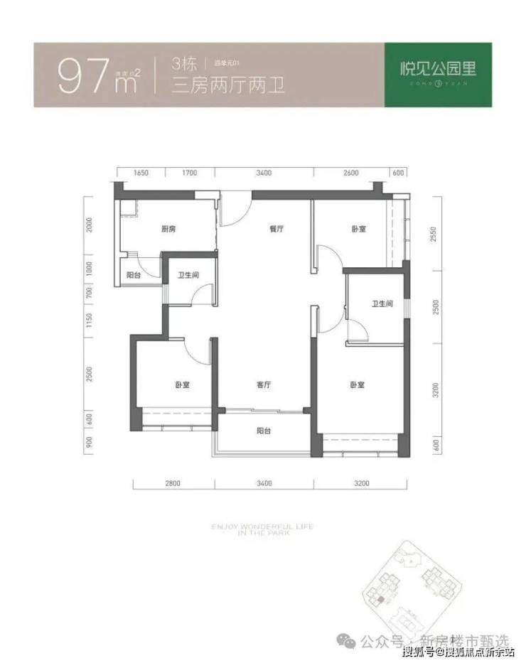 97㎡的3房2厅2卫,折后总价365-366万,单价3.72-3.73万/㎡。