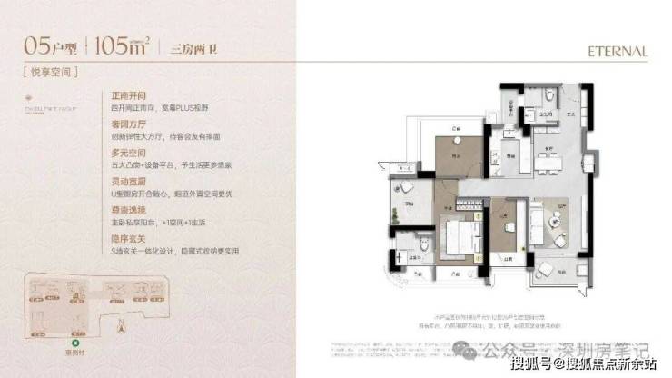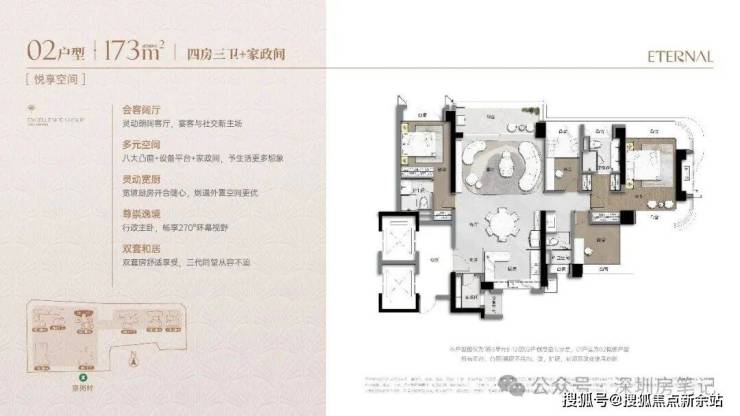 173㎡4+1房三卫(约1701-2068万):最好的户型,专梯入户,门口收纳空间多,大部分朝向向阳。坐拥中轴观景台,头排观礼!窗前即峯景,缦赏盛世灯光秀,平视双龙起舞,一城臻萃尽收眼底,可传世的恒心藏品。景观很好,北向看福田CBD和莲花山,但为了景观牺牲了朝向,好在采光和通风都还不错。主卧三面采光,两个弧形转角飘窗,这种设计在深圳新房中很少看到,空间显得更开阔通透。南北通透,双阳台设计,超大面宽客厅,适配高端改善型人群的品质生活需求。