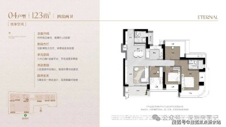 126㎡四房两卫(约1257-1427万):创新户型,弹性大方厅设计,搭配270°环幕视野,俯瞰福田城市景观,主卧套房带独立卫浴与衣帽间,提升居住舒适度