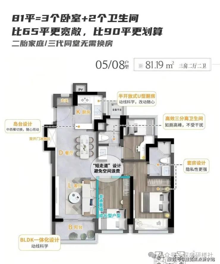 建面约81㎡的三房两厅两卫户型,设计2款,除了具备前一款户型的全部优势特征之外,尺度感更强,并可满足多种人口组合家庭的居住需求。
