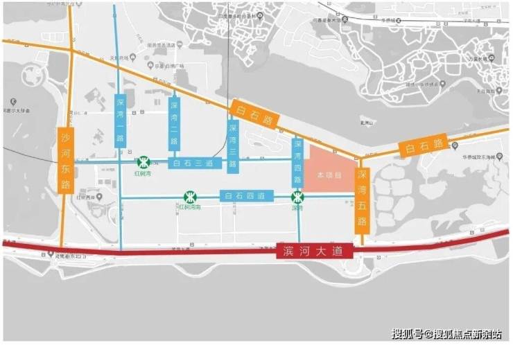 项目交通:本项目东临双向6车道深湾五路、南临双向4车道白石四道,西临双向4车道深湾四路,北临双向6车道白石路,南侧距离深圳的东西主干道—滨河大道约300米;片区有轨道交通9号线、11号线通过:在本地块西南角(深湾四路和白石四道交汇处)设有深湾站;距离地铁11号线红树湾南站约700米。