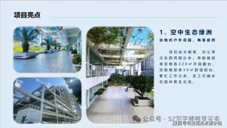 特色配置:每层配套花园露台,单数楼层320㎡大阳台,双数层30㎡露台,每层约300㎡中厅可免费使用