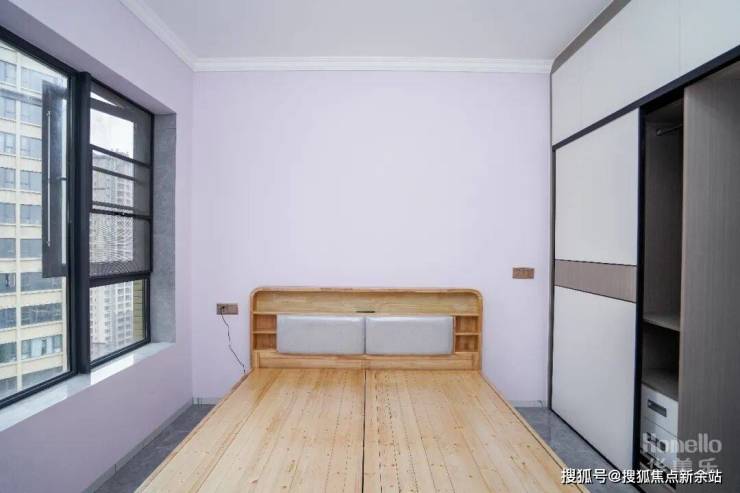 主卧设计延续着简约的设计理念,墙面刷了淡紫色的乳胶漆,属于耐看型,视觉效果很舒服。卧室取消了飘窗设计,让两侧过道空间保持宽敞。