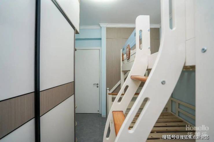 儿童房安装了上下床铺,促进孩子之间的起居互动,方便更好地增进彼此的感情。床榻前方打造了阶梯式抽屉柜,既可以上行下行,还提升了卧室的收纳空间,占地面的也得到了节省,一举三得。