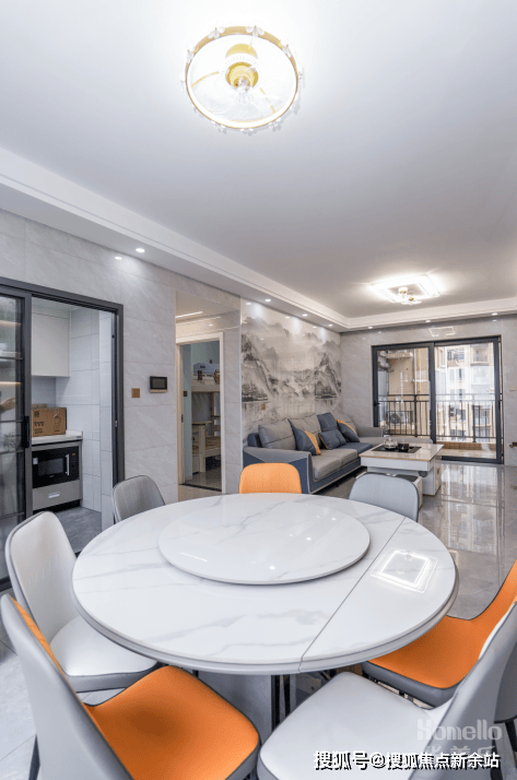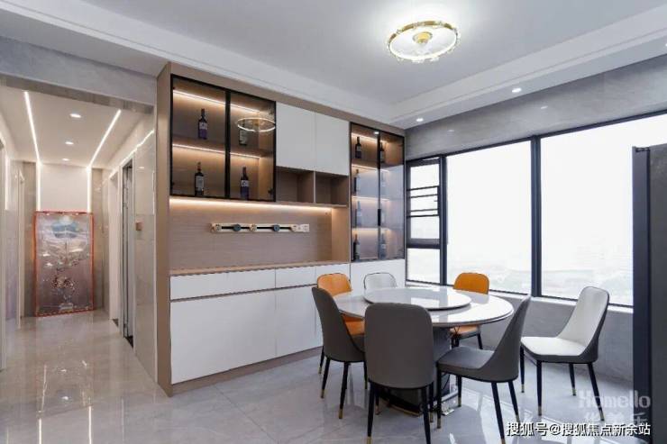 餐厅空间比较宽敞,因此选用岩板圆桌,一来外观大气上档次,二来能轻松应对多人聚餐的情况。餐桌本身的性价比也很高,硬度大,耐用度高,易清理都是其优点,餐桌上方摆放了岩板的转盘,进行一步优化就餐体验。