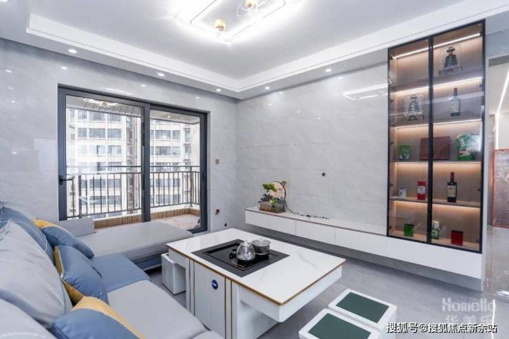 电视背景墙打造了L型的电视柜,立式玻璃柜内部有内置灯,往里放置的装饰或者酒品能有更好的呈现姿态,很好地给客厅提升颜值与档次;下方横向的柜体主要用于补充收纳能力,让一些工具或者杂物也有合理的安放位置,柜面空间则可用于放置绿植或者迎合气氛的摆件,增家客厅的生机。