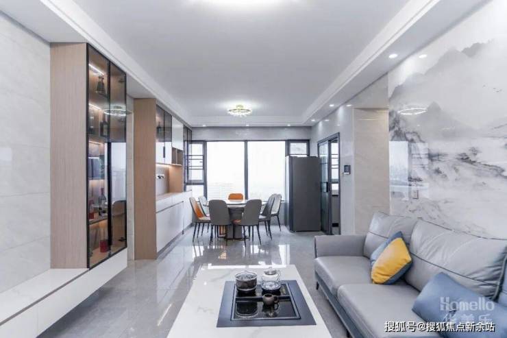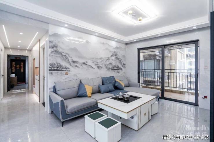 1、通过与业主的详细,大致了解到其各个成员的核心需求。首先把重点放在生活区的客厅部分,全屋主题走的是简约风,客厅自然不例外,不过业主是茗茶的爱好者,我们不妨在里面糅合进中式元素,比如沙发的背景墙利用大板砖打造一幅水墨画,茶几搭配功夫茶一体桌,如此一前一后相互联动,既有画面感,也能满足业主的爱好需求。另外这两者配色偏冷,比价符合简约的基调,不会破坏原有主题的美感,反而让客厅能缔造出生活雅致的画卷,让人更有沉浸感。
