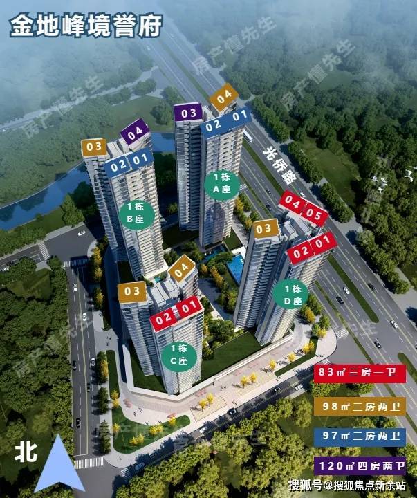 金地峰境誉府,由金地集团打造,总占地面积约1.5万㎡,总建筑面积约7.93万㎡,计容建筑面积约5.4万㎡,容积率3.5,绿化率40%,共由4栋30-32层住宅组成,其中1栋A/B/C座商品房32F,1栋D座商品房30F。