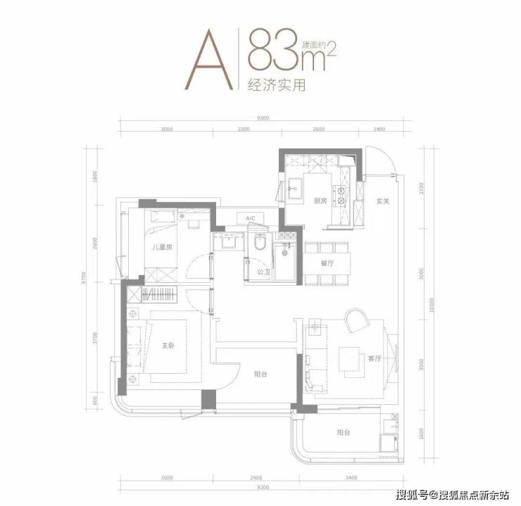 83㎡的3房2厅1卫,设计的是竖厅格局,客厅3.4米开间,客餐厅一体化,三开间朝阳,3个卧室分别是3米/2.9米/2.6米的宽度,U型厨房,卫生间三段式分离设计,得房率:75.64%(不含赠送),有朝南向或东北向。