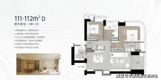 【111-112㎡ 3房2卫】D户型:经典竖厅户型,东南朝向 (02、03)看城市景观