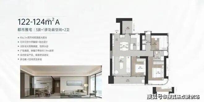 【122-124㎡ 3+1房2卫】A户型售楼处电话:400-859-7606:竖厅户型,双阳台设计。西南朝向(04、05)看红树林湿地及海景
