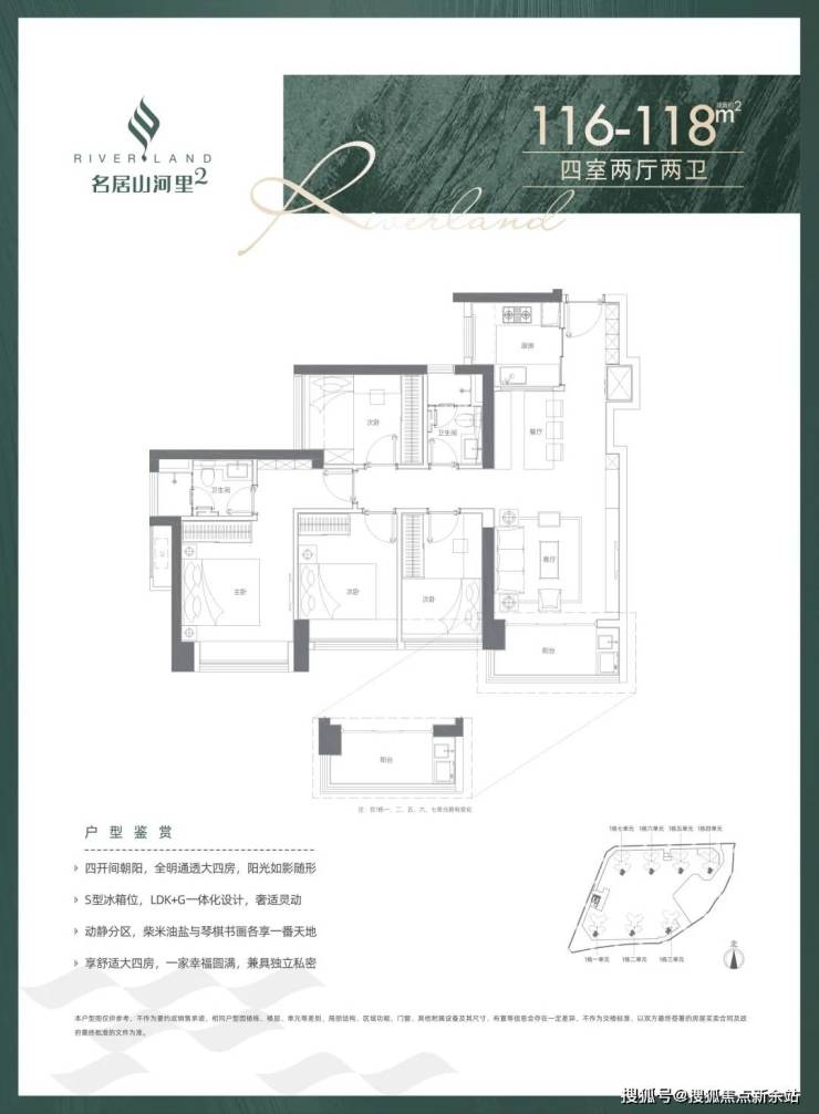 116-118㎡的4房2厅2卫(04户型),设计的是竖厅格局,客厅3.7米开间,S墙设计预留冰箱位,四开间朝南,U型厨房,得房率:73.85%(不含赠送),阳台1.5米进深,东南向。