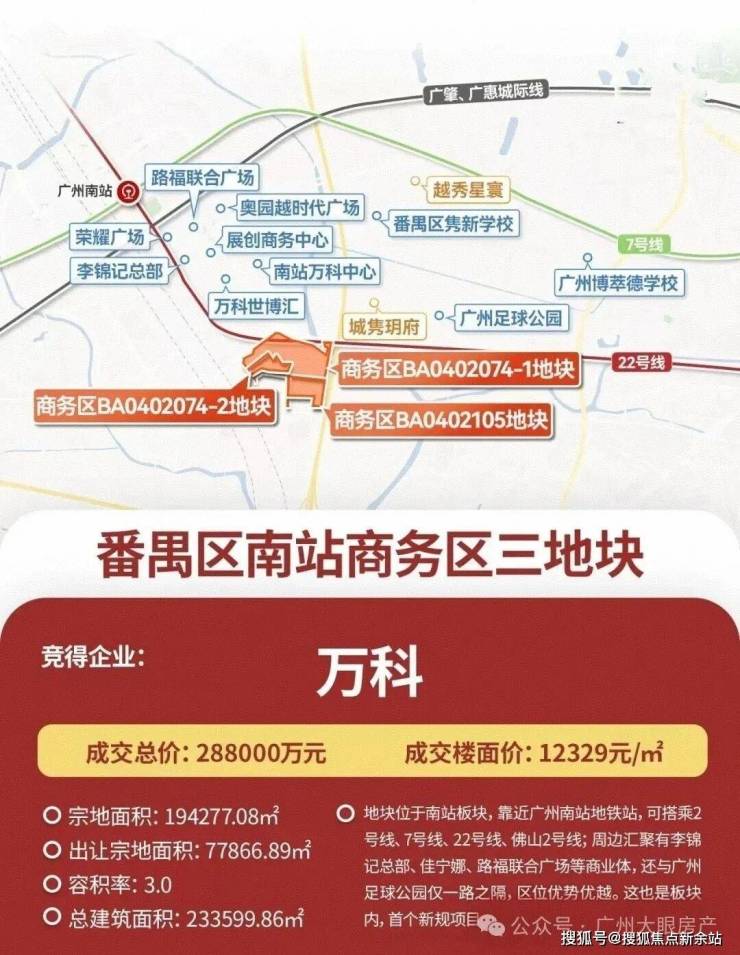 2024年12月17日,万科以底价28.8亿拿下广州南站商务区三宗宅地,总面积约23万㎡,折合楼面价约1.1-1.3万/㎡。