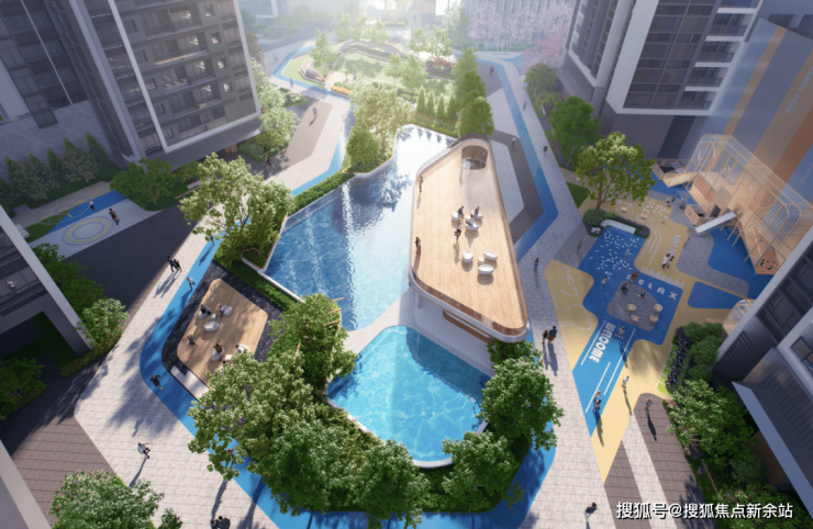 多元交互园林:空中运动花园、全龄亲子双游泳池、环氧跑道、稚趣IP乐园、城市会客厅等,亲子、社交、远动一应俱全;