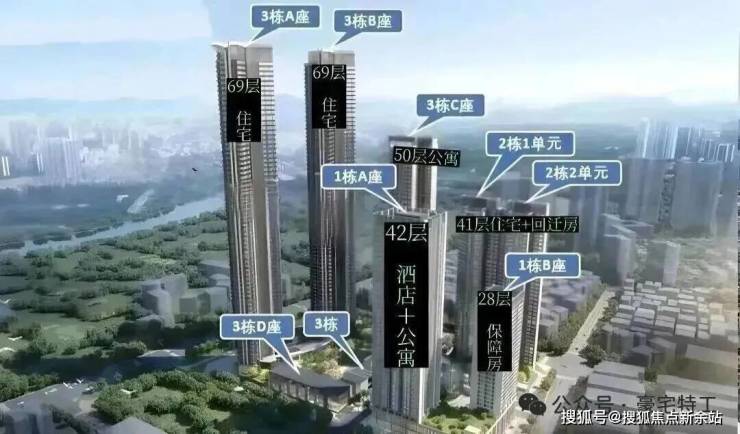 总栋数:8栋(1A栋42层酒店+公寓、1B栋28层保障房,2栋1/2单元41层住宅,3A/3B栋69层住宅;3C栋50层公寓、3D栋4层公寓)
