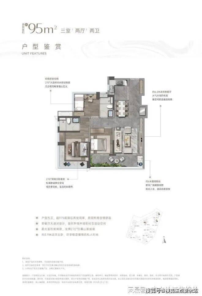 设计亮点:LDKB 一体化设计,6.3米跑道式阳台连通次卧,主卧及一次卧配备270°全景飘窗,东北向看山景或西南向看海,得房率约91.6%(含赠送)