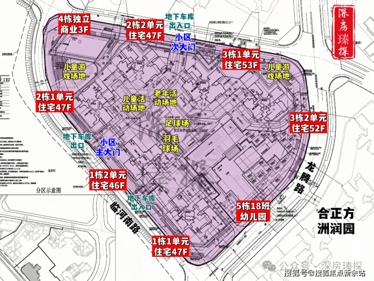 合正方洲瀚府,总占地面积约3.05万㎡,总建筑面积约27.4万㎡,计容建筑面积约20.11万㎡,容积率6.6,绿化率40.01%,共由6栋总高46-53层的住宅组成,其中1栋1单元/2栋1/2单元住宅47F,1栋2单元住宅46F,3栋1单元住宅53F,3栋2单元住宅52F,5栋是1所18班制幼儿园,园区内规划有多个儿童游戏场地,羽毛球场,足球场。