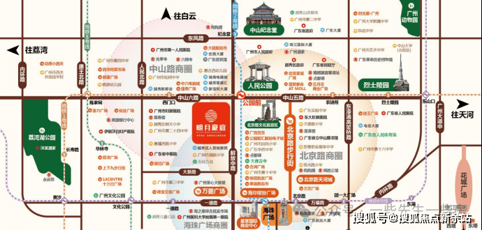 商业:步行 5 分钟达北京路步行街、捷登都会,3 公里内中华广场、天河城百货、海珠广场等 8 大商城环绕,商业能级顶尖。