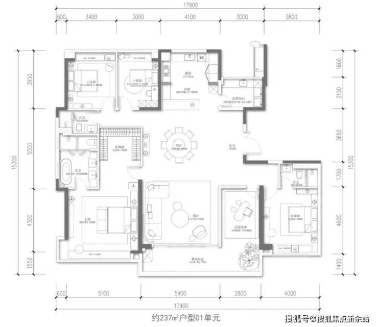 楼王顶豪:建面约 237㎡ 4+1 房两厅三卫,2 梯 2 户独梯入户,私享独立电梯厅,70㎡客餐厅一体化设计,8.2 米 L 型阔景阳台,中西厨分离,双南向套房主卧带景观浴缸,顶豪配置拉满。