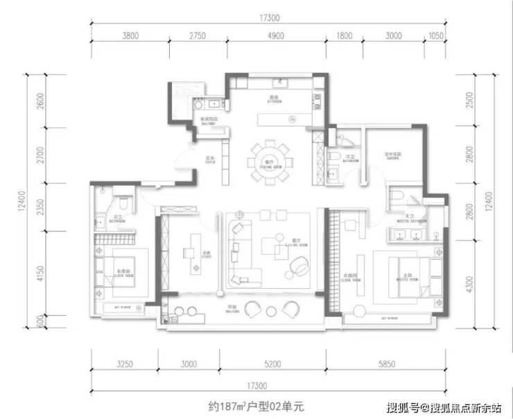 顶改主力:建面约 187㎡ 3+1 房两厅三卫,四开间朝南,超 5 米进深南向景观衣帽间,中西厨双动线,酒店式主卧套房,适配终极改善客群;