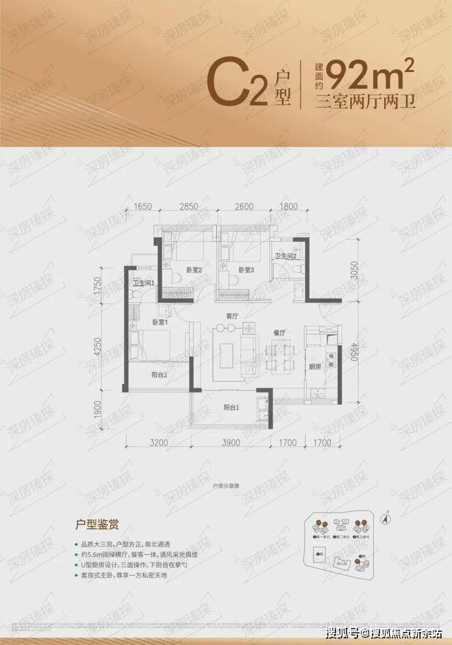92㎡的3房2厅2卫,设计的是横厅南北通透格局,客餐厅5.6米开间,LDKB一体化设计,四开间朝南,3个卧室分别做到了主卧12.43㎡/次卧9.22㎡/次卧8.84㎡(实测面积,去掉墙体飘窗),U型厨房,公卫三段式分离,得房率约96.08%(包含赠送),阳台主朝西南或东南向。靓点都不需要睡飘窗。
