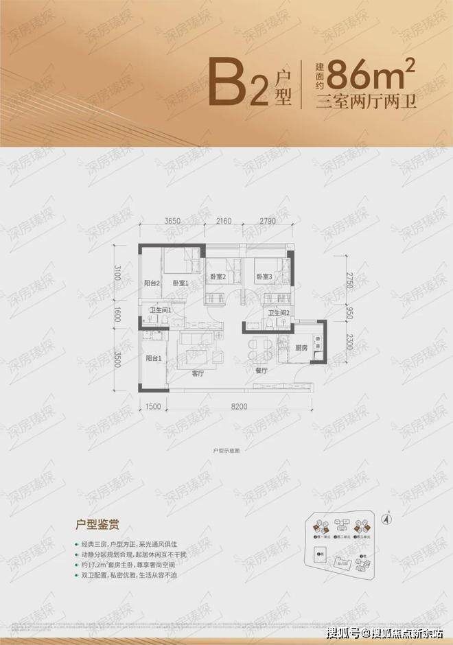 86㎡的3房2厅2卫,设计的是竖厅格局,客厅3.5米开间,进深8.2米,LDKB一体化设计,三开间朝南,3个卧室分别做到了主卧13.59㎡/次卧7.95㎡/次卧6.06㎡(实测面积,去掉墙体飘窗),U型厨房,公卫三段式分离,得房率约88.08%(包含赠送),东南或西南朝向。
