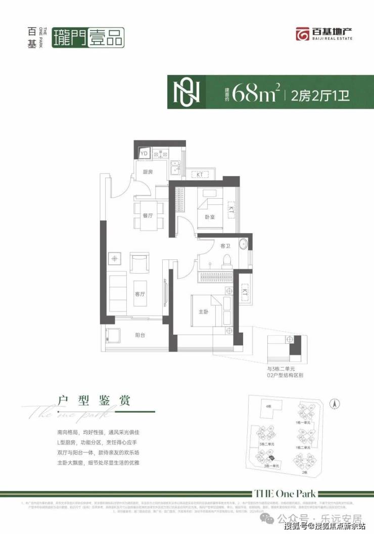 68㎡的2房2厅1卫,仅3栋1单元02户型,设计的是竖厅格局,客厅3.2米开间,LDKB一体化设计,L型厨房,卫生间干湿分离,得房率:71.3%(不含赠送),东南朝向。
