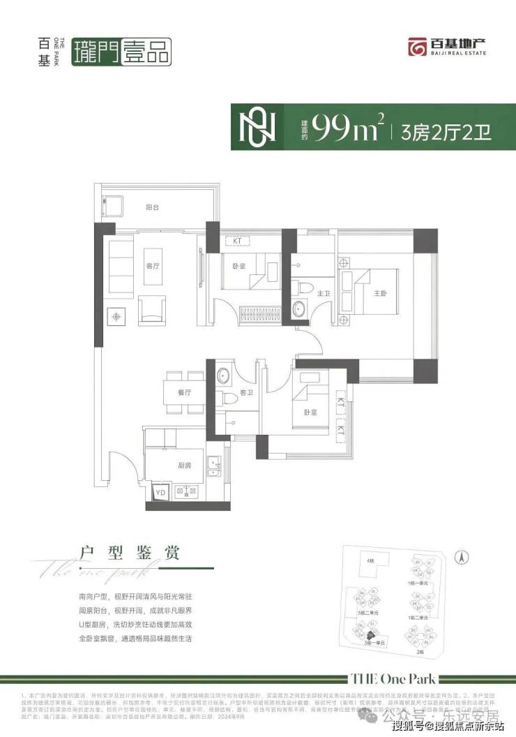99㎡的3房2厅2卫,设计的是经典竖厅格局,进门入户玄关,客厅3.9米开间,LDKB一体化设计,动静分区,四开间朝南,主卧三面飘窗,U型厨房,卫生间干湿分离,得房率:71.29%(不含赠送),东南朝向。