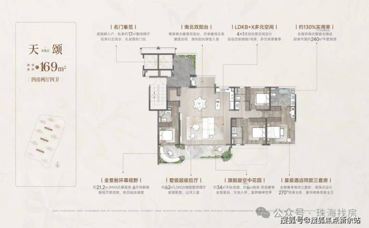 四代洋房·奢享写意人生 | 双入户大堂、一梯一户,稀缺至高约130%实用率(不含电梯厅),6面朝南,270°环幕采光,定制约6m错层空中浮岛,奢享墅质生活