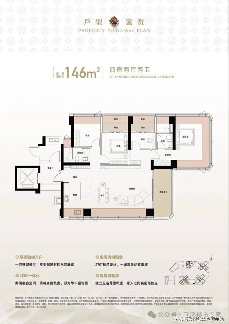 146㎡户型东南朝向直面沙头角湾,主卧及客厅双阳台形成“270°环幕海景剧场”。对于追求海景生活的购房者来说,这个户型提供了每天欣赏海景的沉浸式体验。