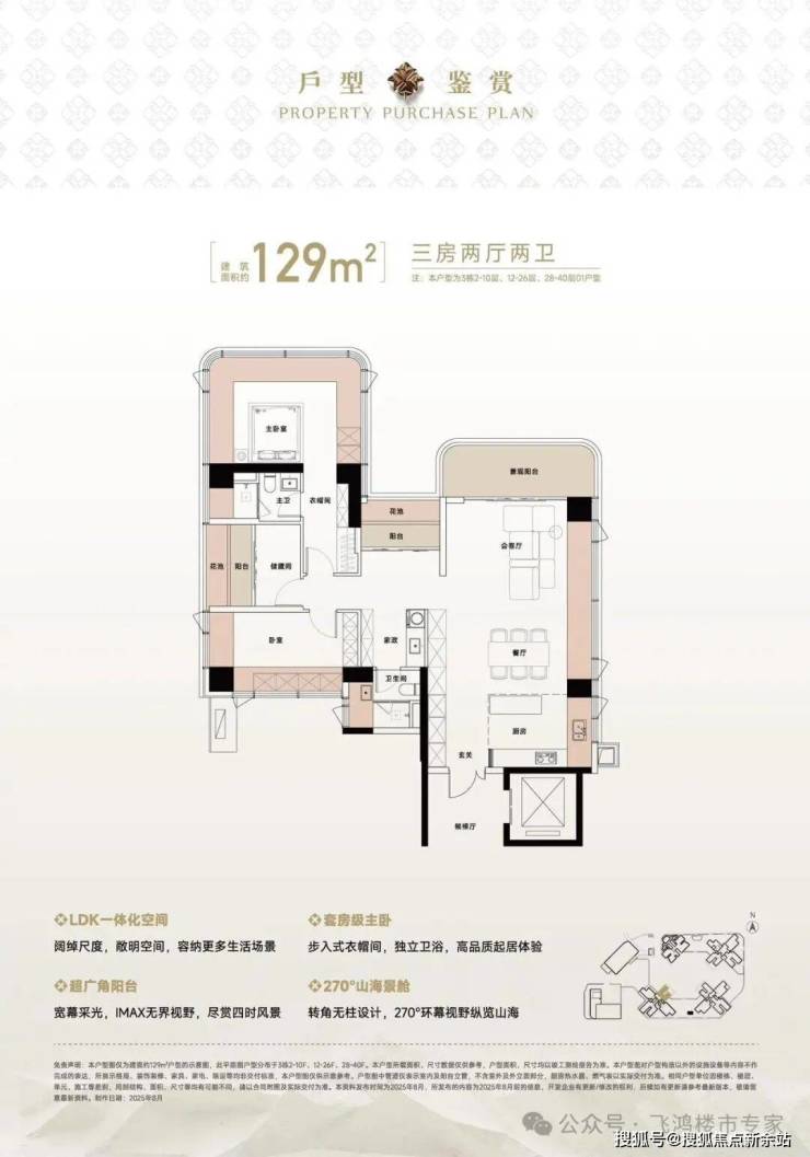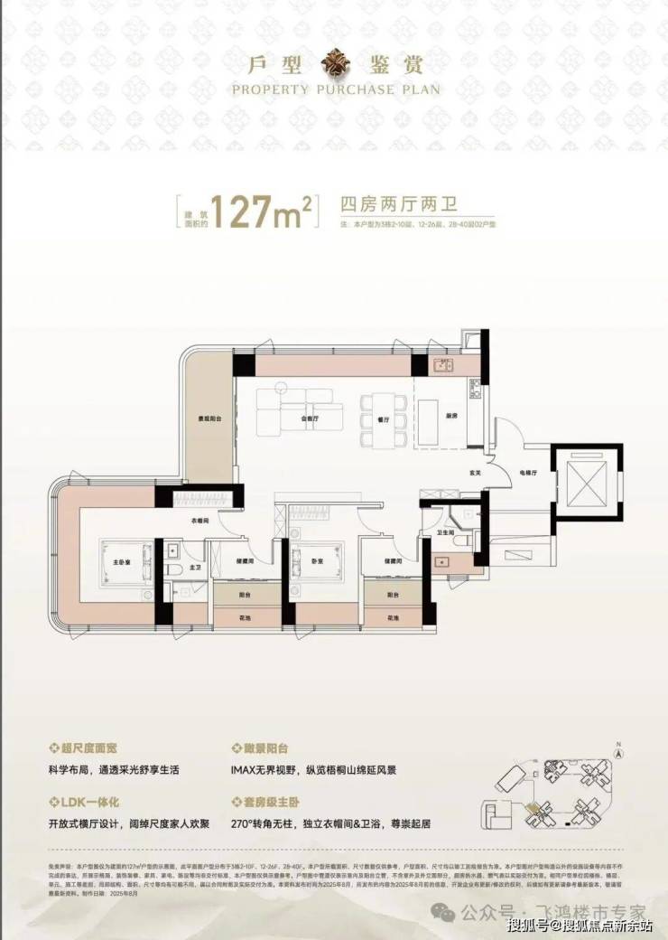 127-129㎡四房则开启了不同的生活体验。这些户型独享独立电梯厅,六开间朝南,南北通透。得房率约105%(含赠送),主卧套房配备独立衣帽间、卫浴间及270°转角窗,实现“山景+园景”双景观面。